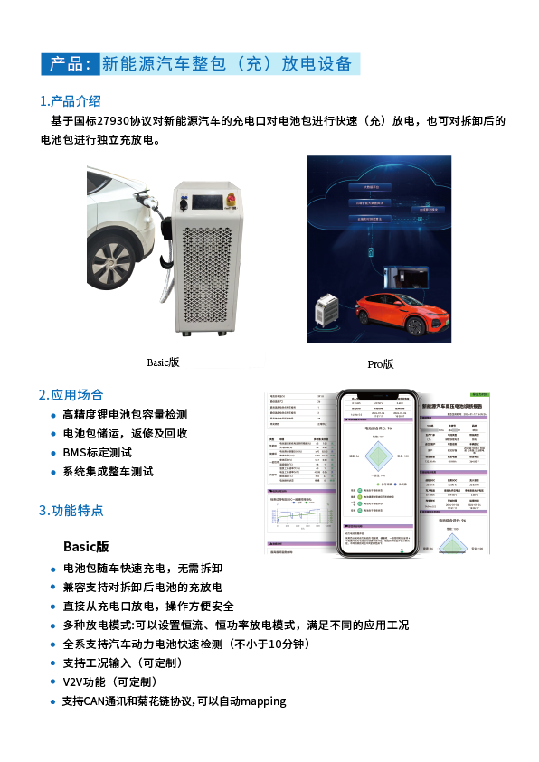 產(chǎn)品介紹:基于國(guó)標(biāo)27930協(xié)議對(duì)新能源汽車的充電口對(duì)電池包進(jìn)行快速(充)放電,也可對(duì)拆卸后的電池包進(jìn)行充放電。
